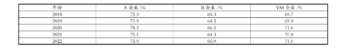 表1 A企業(yè)與B企業(yè)、YM企業(yè)采購成本占營業(yè)收入比率
